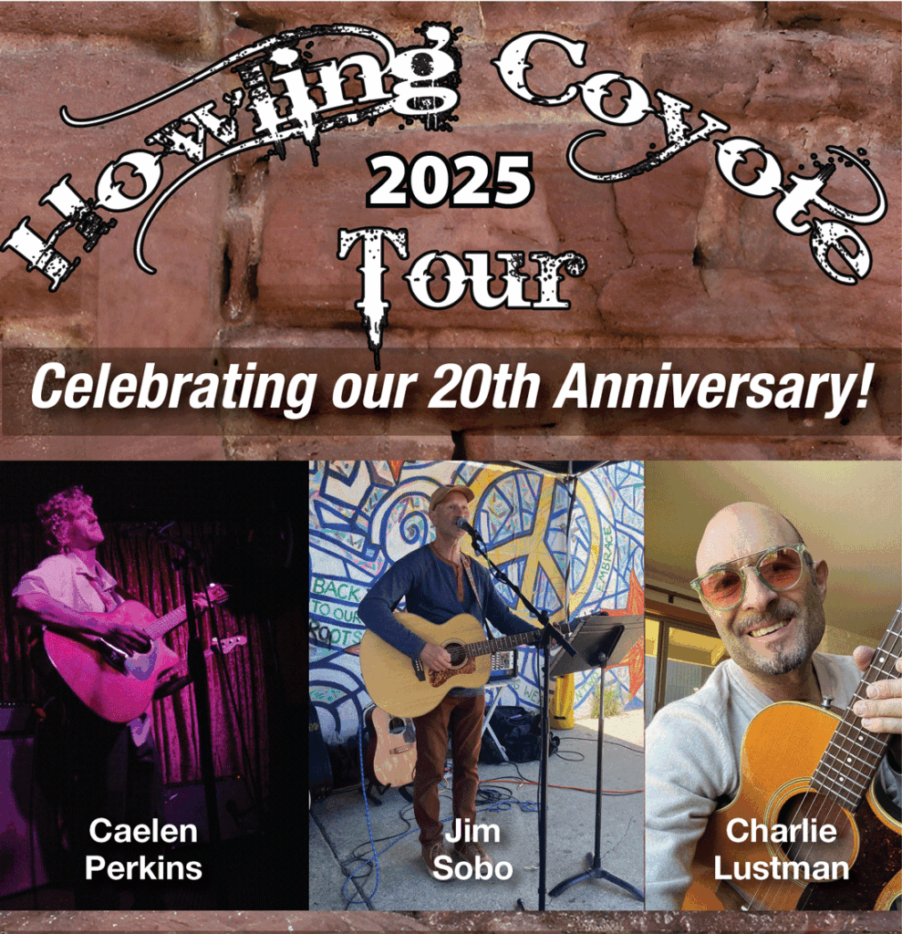 The Howling Coyote Tour is a touring musical showcase whose mission is to expose and promote independent talented singer-songwriters from the Southwest, all of whom have music of content, and through the diversity of each artist’s style; complement each other’s work. The showcase introduces the listener to several artists at one show. As the tour progresses, the show evolves, which keeps things lively and fresh for both the artists and the listener. Artists have CDs available at the shows, their websites, iTunes, etc. Artists involved perform weekly in and around Arizona and have established followings. Each year, in the summer season, we take the showcase into California or Colorado from and throughout Arizona!